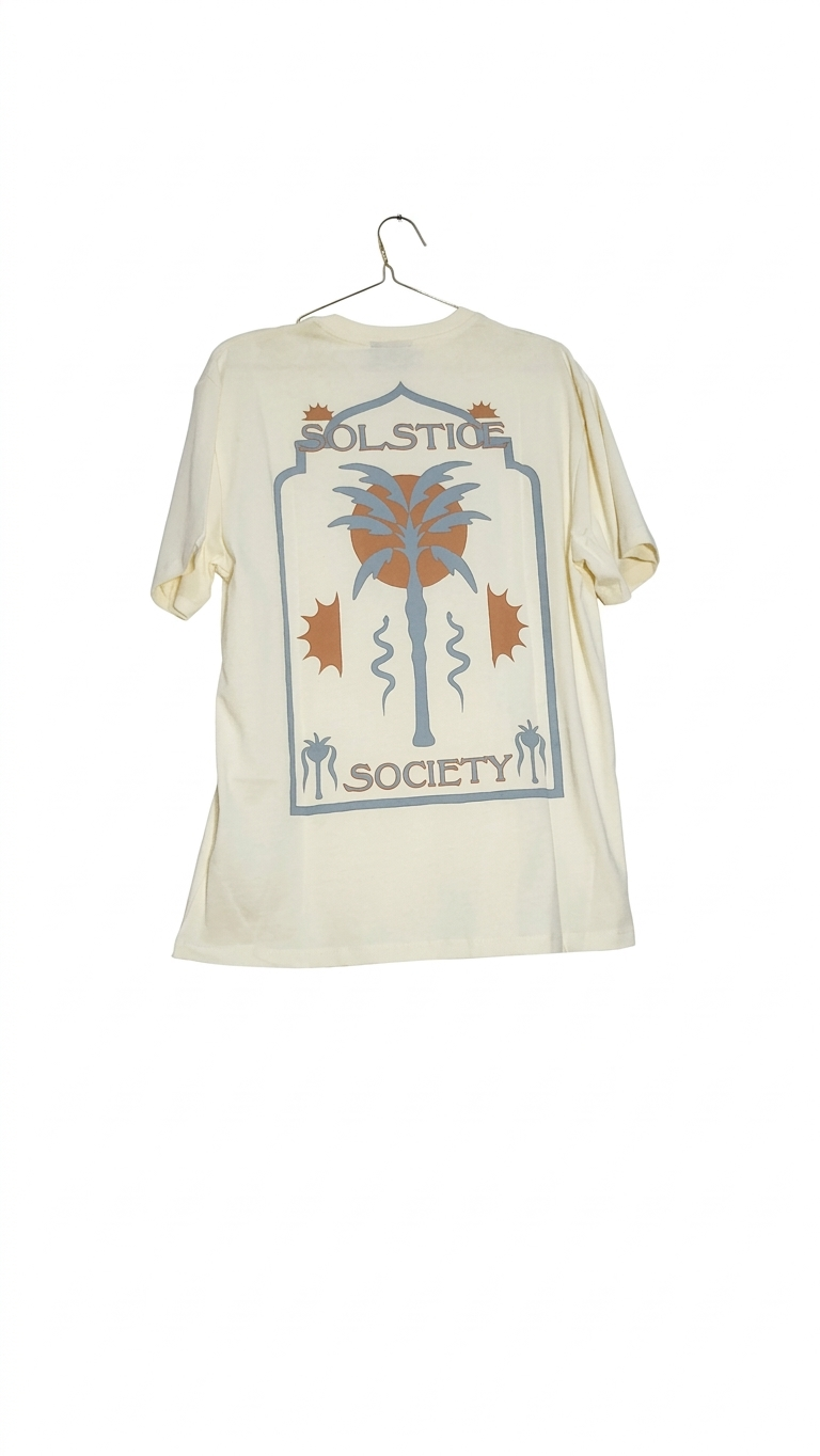 Capture the essence of summer with the Solstice Society “Desert Oasis” tee. This premium short-sleeve shirt is crafted in a soft cream-colored cotton, providing a relaxed and breathable fit for all-day comfort.