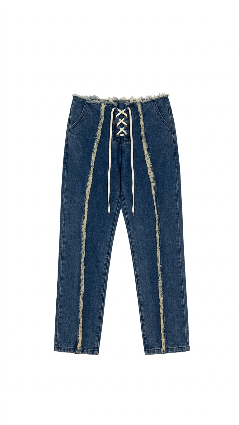 Make a bold statement with these uniquely reconstructed denim jeans. This pair stands out with a distinctive cream-colored lace-up fly, replacing the traditional button-up for a corset-inspired look. The front of the jeans is accented by two prominent vertical seams featuring heavy, raw-edge distressing that runs from the waist down to the hem, creating a striking visual contrast against the deep indigo wash.