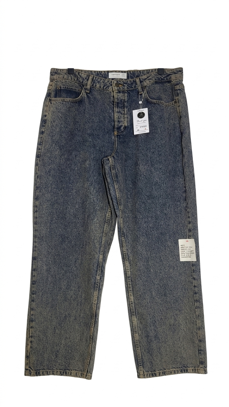Step into a retro-inspired aesthetic with these TOPMAN wide-leg jeans. Crafted in a heavy-duty denim, they feature a distinctive, textured acid wash in a versatile blue. The silhouette is explicitly wide-leg, offering a relaxed and loose fit through the thigh and calf, providing that authentic ’90s skate-culture profile. These jeans feature a five-pocket design, durable contrast stitching, and a classic button fly, and come complete with authentic TOPMAN branding and hang tags. Perfect for pairing with oversized tees and chunky sneakers to complete the look.